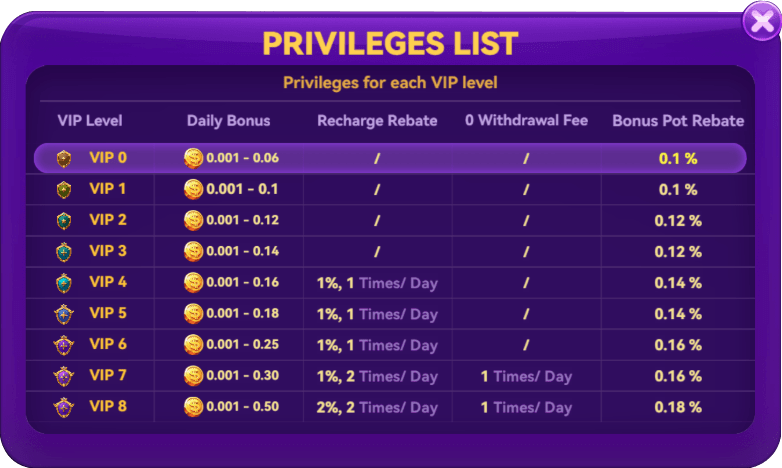 VIP8: Get 0.001- 0.50 Everyday/0 Withdrawal Fee(once)/2% Recharge Rebate(twice)/0.18% Bet Rebate