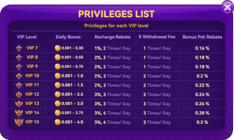 VIP7: Get 0.001- 0.30 Everyday/0 Withdrawal Fee(once)/1% Recharge Rebate(twice)/0.16% Bet Rebate